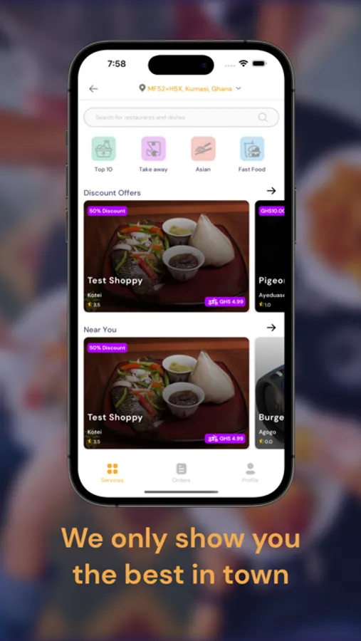 To view the content, open a service menu by tapping groceries or virtual kitchen, in the maps, search "Accra" as City to see currents shops enrolled.