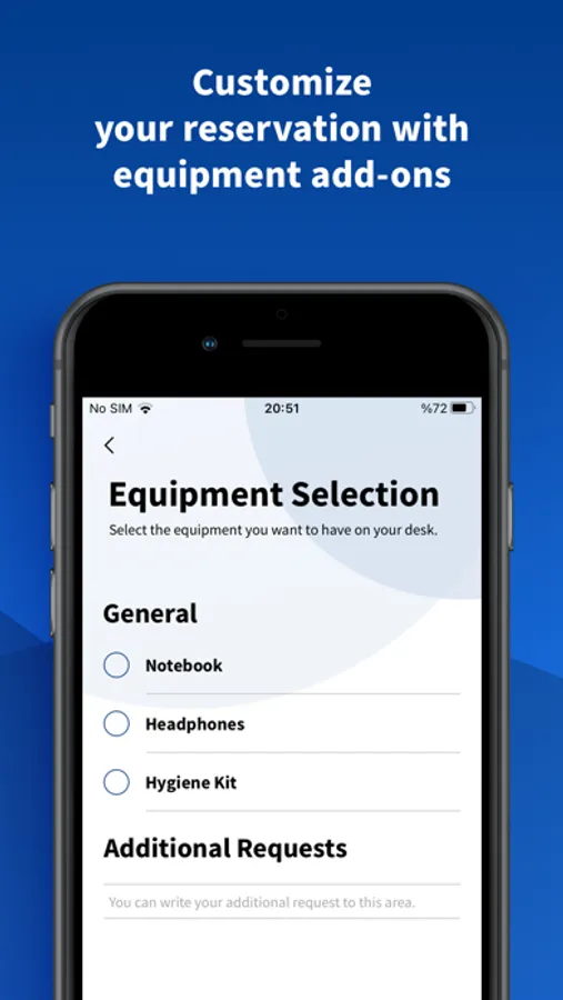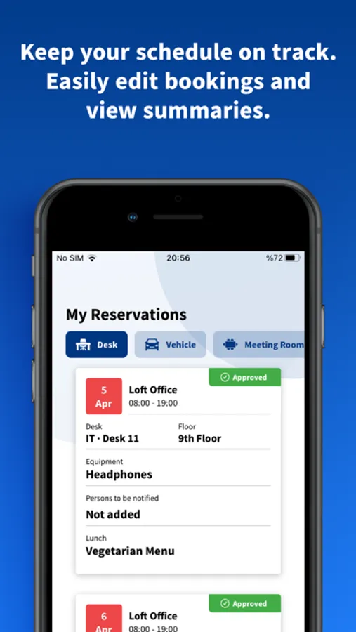 Desk-In is a user-friendly reservation application that can be used by organizations of all sizes. With Desk-In, you can easily define the floor plans, departments, and workspaces of your offices, and provide your employees with the ability to make reservations with date, time, equipment, parking, and meal selection options.