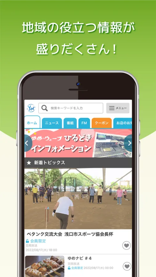 ケーブルテレビで放送された地域ニュースやイベント情報の配信をはじめ、エフエムゆめウェーブのラジオ聴き逃し配信も行っています。