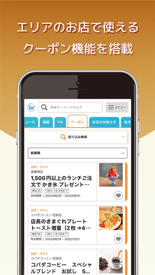 地域のお店が発行するクーポンや、お店からのお知らせ機能も搭載。