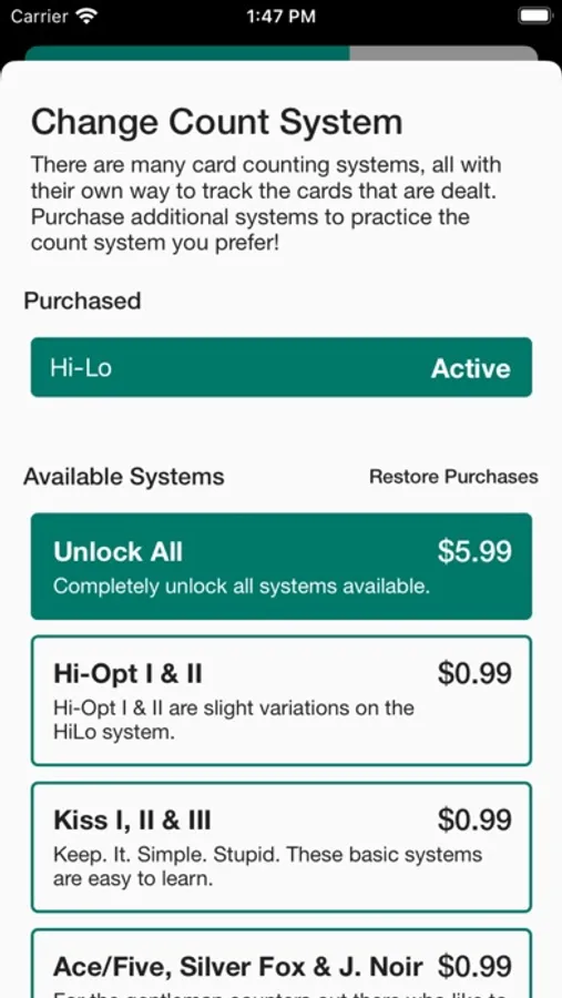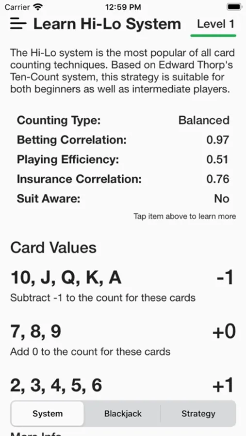 Read about the counting system you have active in the app while also being able to learn the basics of Blackjack.