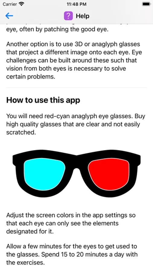 Buy high quality red-cyan anaglyph glasses that are not easily scratched or clouded. Adjust the screen colors in the app settings so that each eye can only see the elements designated for it. Allow a few minutes for the eyes to get used to the glasses. Spend 10 to 15 minutes a day with the exercises.