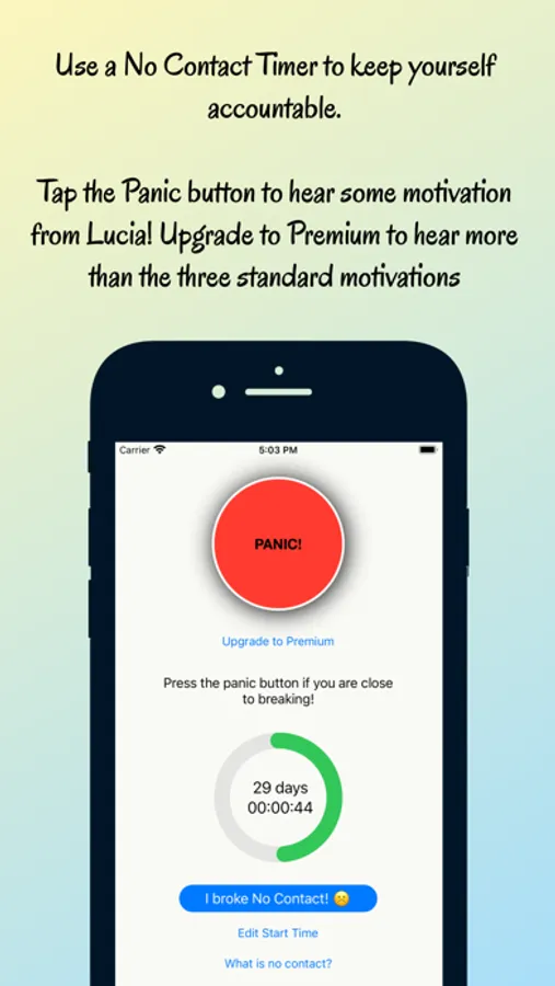 It also contains a panic button which you can press to hear a motivational message from Lucia that will stop you from breaking no contact.