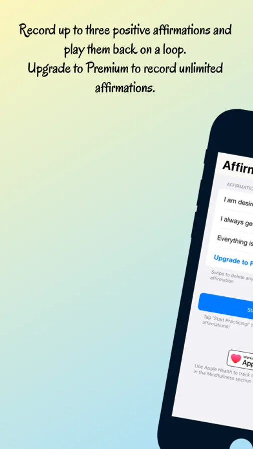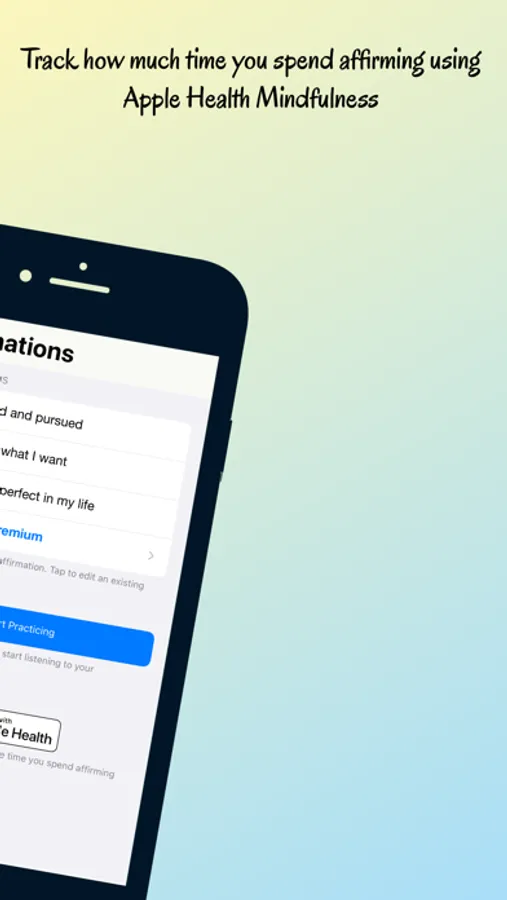 - Ability to record and play back affirmations on a loop with peaceful music and a choice of beautiful scenery in the background- Time spent listening to affirmations can be tracked in Apple Health