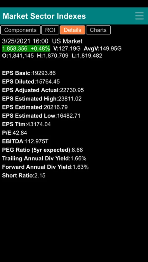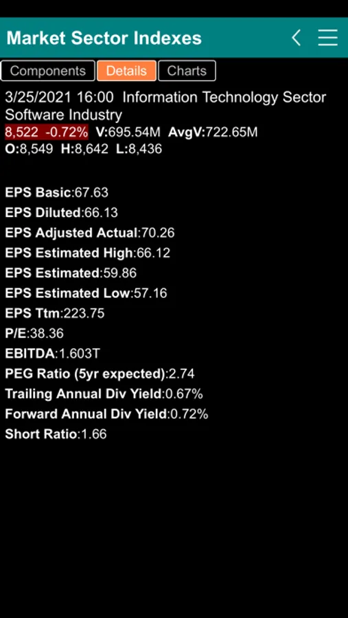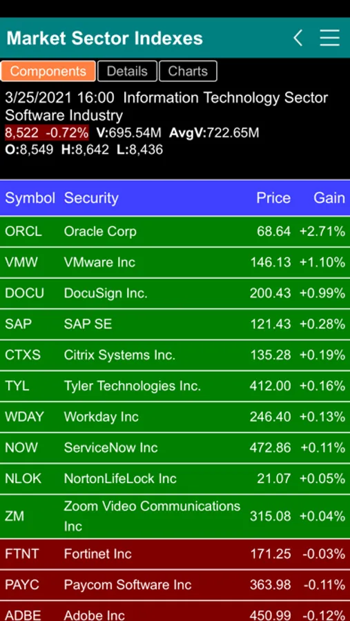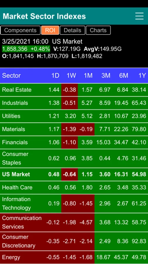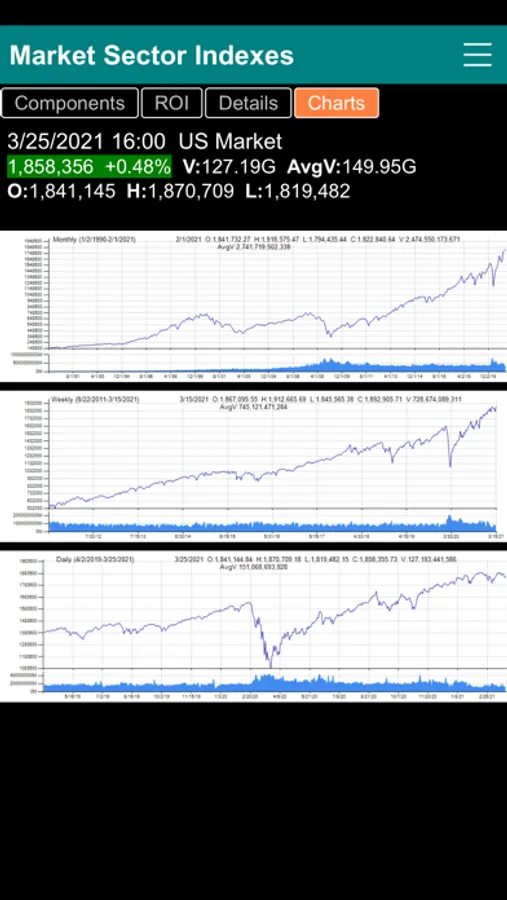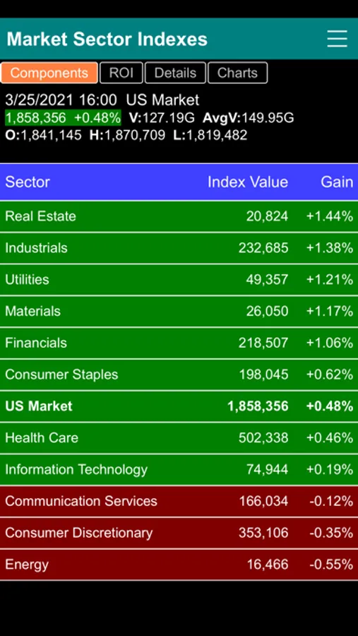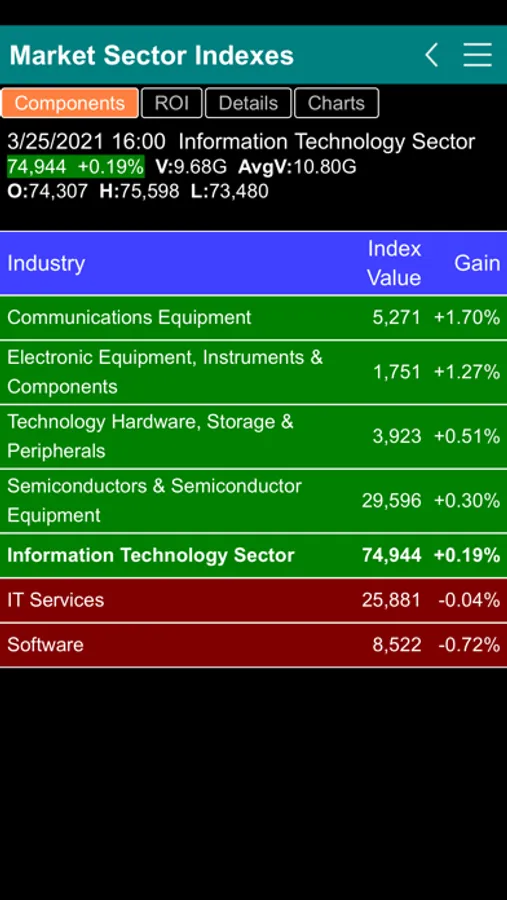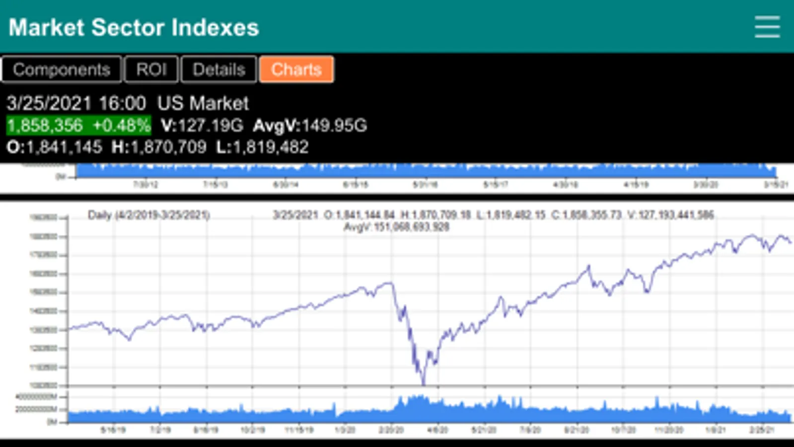 This app includes four types of information for each sector or industry index. The Components screen gives a list of underlying components of the index with prices and gains/losses. The Performance screen shows the list of components of the index with performance data from daily, weekly, monthly, 3-month, 6-month and one year periods. The Details screen gives specific information of each index, including the trading volume, the 52-week average volume, the allocation percentage of the industry within the sector, earning per share (ttm EPS) of the index and the Price to Earning (ttm P/E) of the index. The Graph screen gives the monthly, weekly and daily price chart of the index.