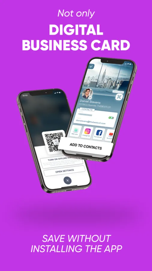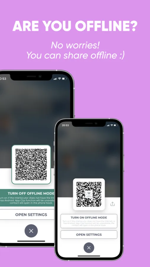 In order to open a digital business card, your interlocutor does not need to install an application, the business card will be displayed via App Clips, new technology from Apple, which we have already integrated.