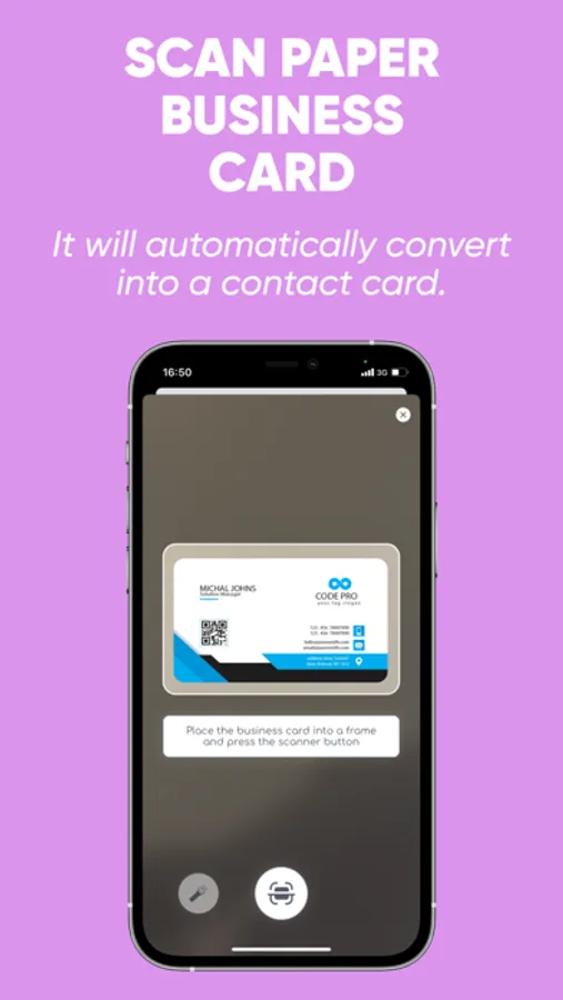 Forget about old business cards forever. You no longer need to waste your time and money creating a new batch of business cards. In addition, your contact details and information will definitely not be lost and will be saved straight to the phonebook.