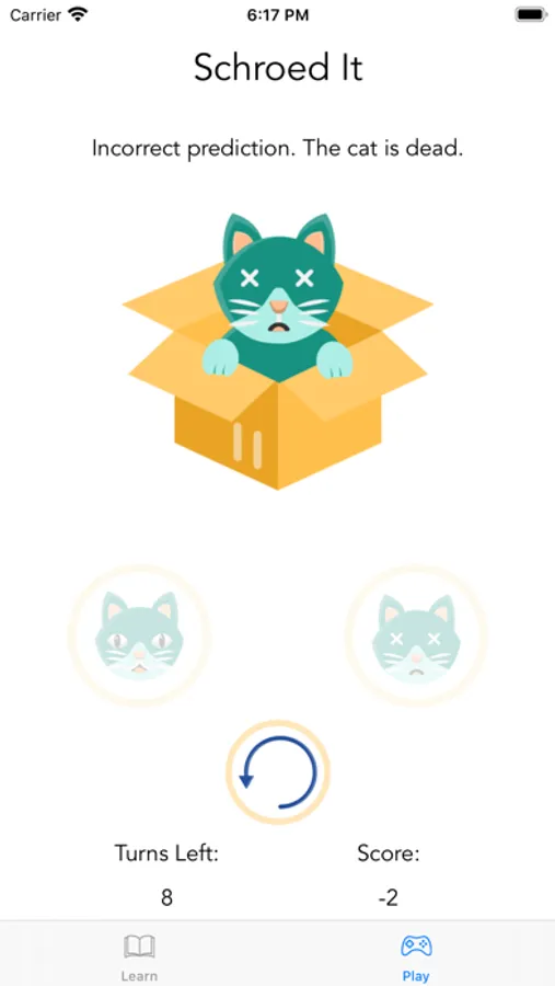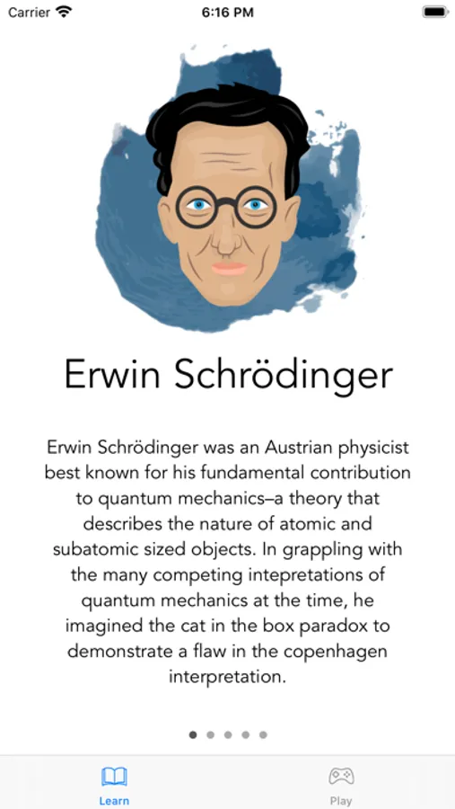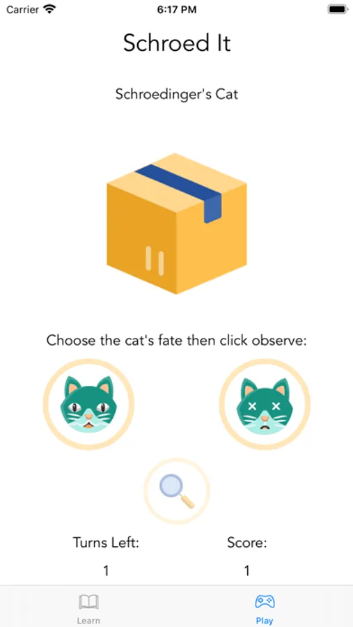 Learn more about Erwin Schrödinger and his contributions to quantum mechanics then play a game of luck and chance, guessing the state of the cat (dead or alive) before making your observations and collapsing the wave function!