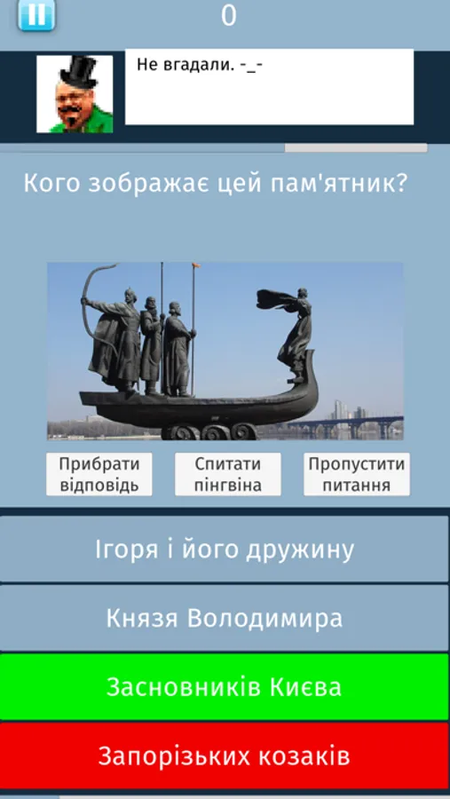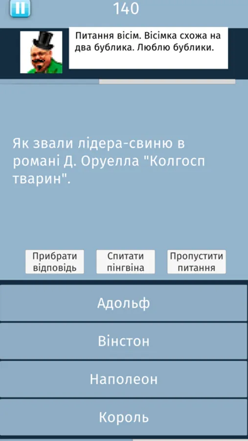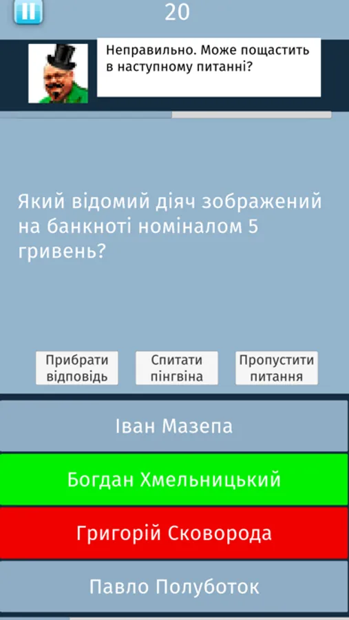 Квіз українською. Питання, чотири варіанти відповіді. Одна з них правильна. Три підказки. Два варіанта гри: 15 питань на виліт (як в класичних телешоу) і 15 питань з можливістю давати неправильні відповіді.