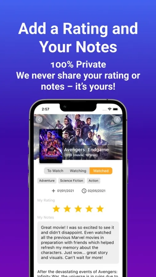 • Private: 100% Private. We never share your rating or notes – it’s yours!