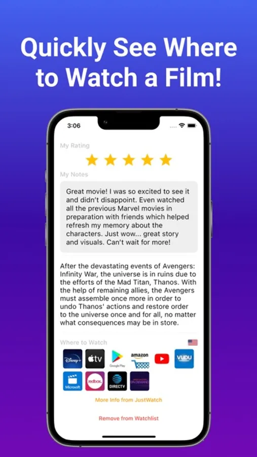 With all the choices on Netflix, Amazon Prime Video, Apple TV+, HBO Max, Hulu, and more we’re constantly facing choice paralysis about what to watch. Use MyWatchlist to keep track of all those movies and TV shows you’ve been wanting to check out!
