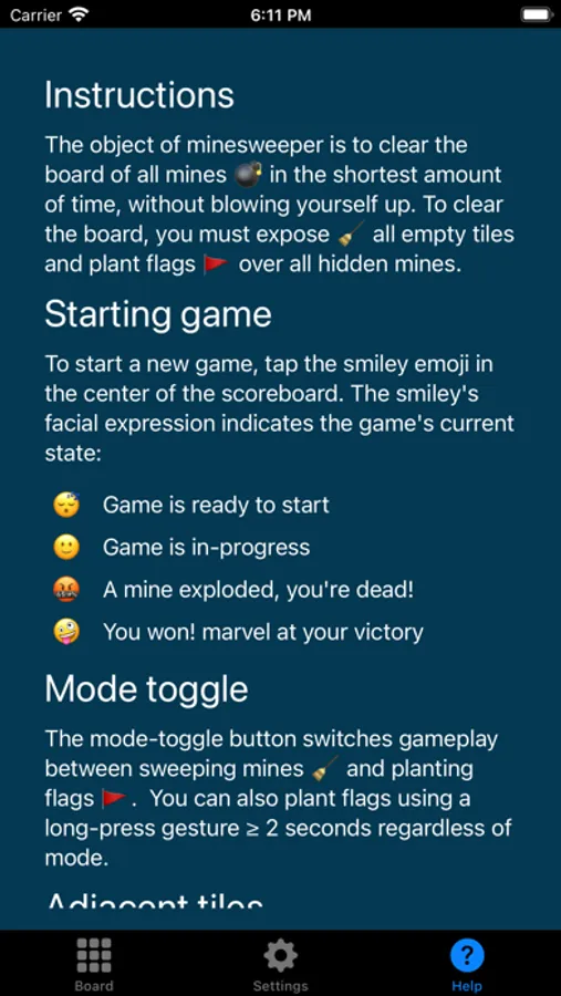 Minesweeper is a single-player puzzle video game. The objective of the game is to clear a rectangular board containing hidden bombs without detonating any of them. The game originates from the 1960s, and has been written for most computing platforms in use today.