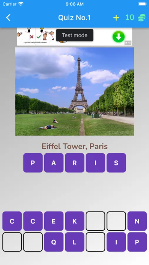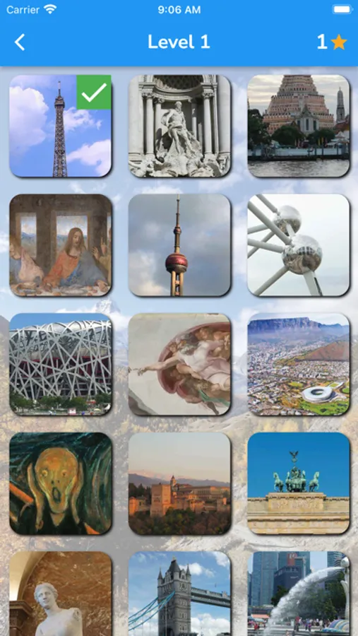 Each level has a quiz photo. Just pick letters from the provided question alphabets, for example, the picture "Eiffel Tower", everyone knows that it is in Paris. You just select the alphabet in order to make 'PARIS'. If the answer is correct, you will get 1 star. The more stars you have, the more levels to unlock.