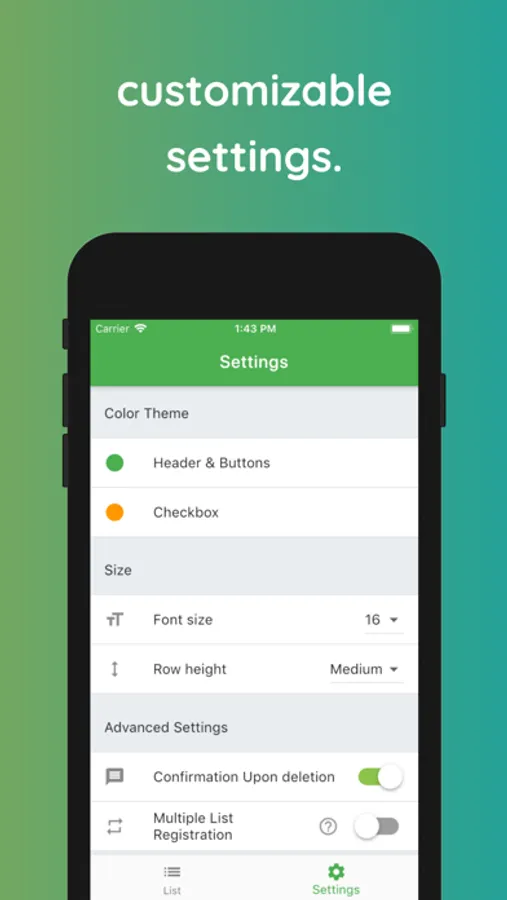 In the settings screen, you can set basic settings such as theme color, text size, row height, and more detailed settings as well such as hiding the confirmation message when deleting an item, and allowing you to add items consecutively