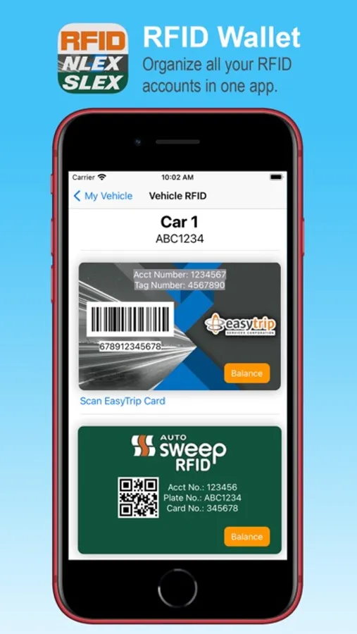 RFID Wallet organizes all your EasyTrip and AutoSweep account details in one cool app. Account Cards can be difficult to store and keep track specially if you have multiple vehicles. RFID Wallet can scan, save, and organize multiple rfid account details, and display machine readable Barcodes and QR Codes for easy reloading and use.