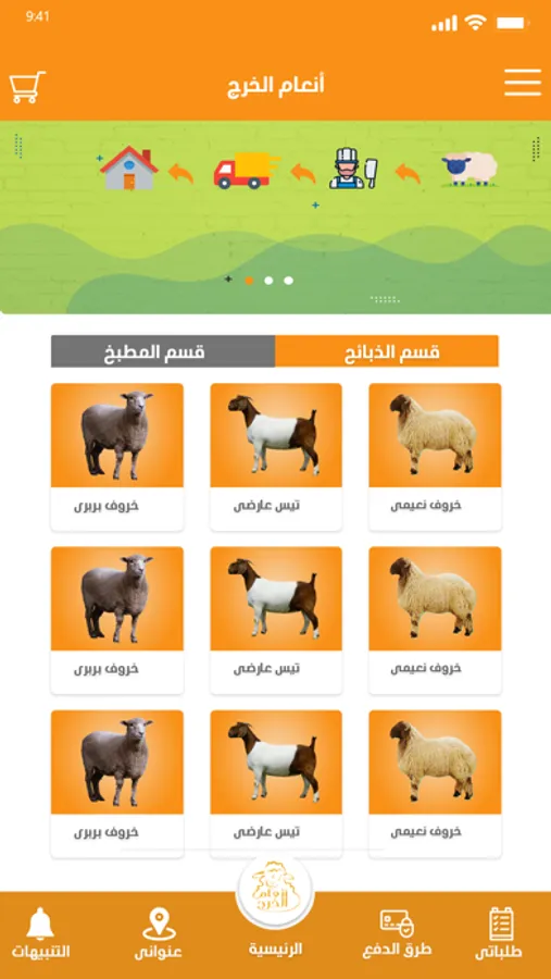 مؤسسة أنعام الخرج لتجارة الأغنام المذبوحة والمطبوخة متخصصة فى أفضل الذبائح ( نجدي - نعيمي - حرى - تيوس عارضية - حاشي ) وتهدف الى تلبية متطلباتكم عبر تطبيق أنعام الخرج نقوم بالتوصيل للمنازل والقصور والاستراحات والمطابخ ونلبي كافة طلبات المناسبات الكبيرة مهما كان الطلب ونضمن الطلب على شرط الزبون ، ونقوم بعملية الذبح قبل الاستلام بساعة ، كافة الذبائح يتم عرضها علي طبيب بيطري لضمان السلامة .
