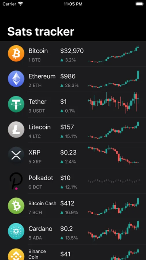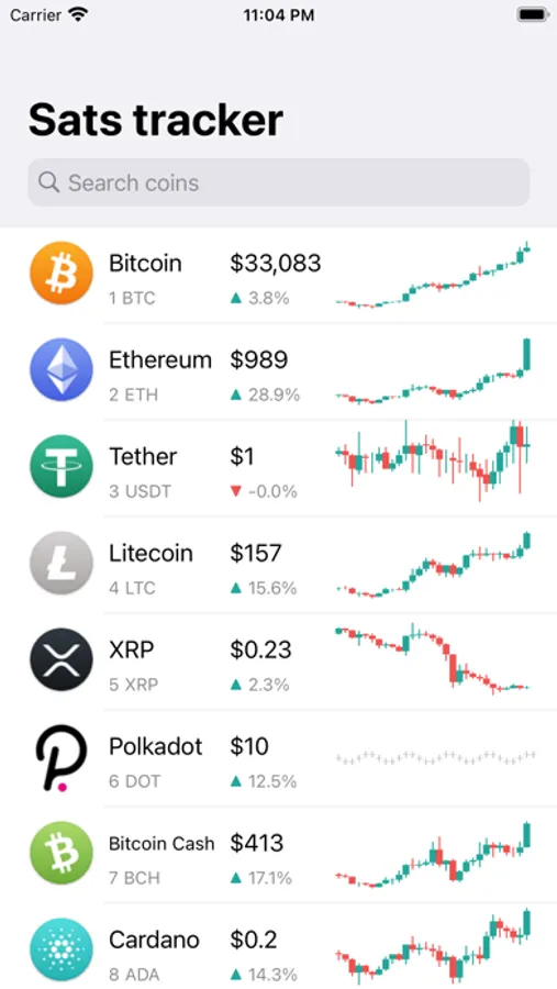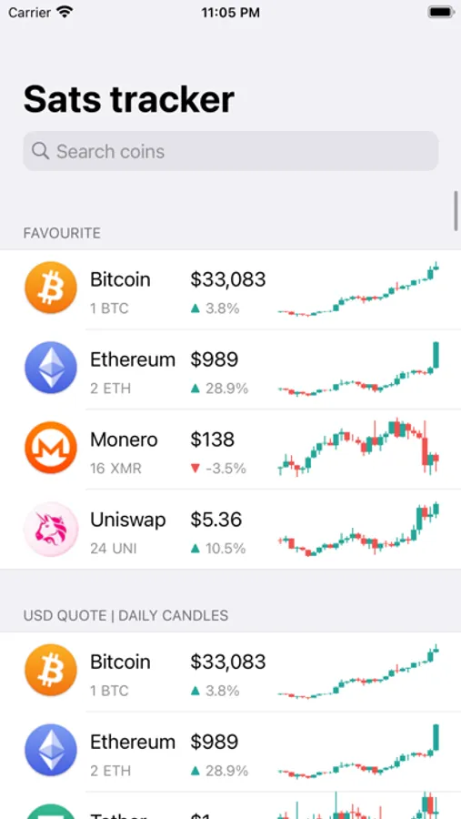 Simple crypto currencies price tracking app. Displays the latest price and daily USD candles.