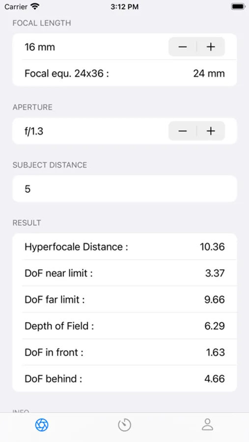 * The start ("DoF near limit") and the end ("DoF far limit") of the sharpness zone;