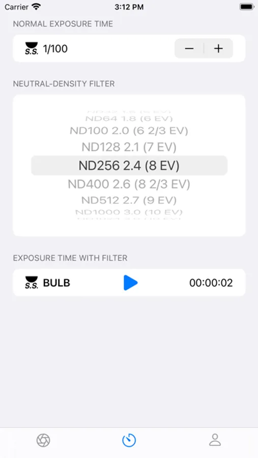 To calculate the correct exposure start by taking a picture without a filter. Note the exposure triangle settings, including shutter speed. Indicate the latter in the "normal exposure time" area. Then choose the reduction level in the "ND filter" zone. Read the exposure time with filter in the "Exposure time with filter" area. On your hybrid, without changing the ISO and aperture, take an image by applying the exposure time. For times longer than 1 second you can use a built-in timer.