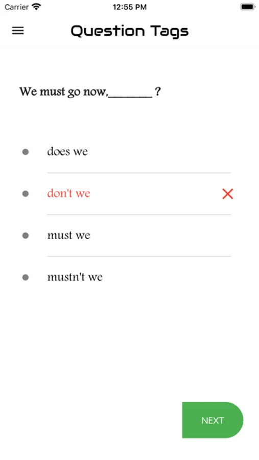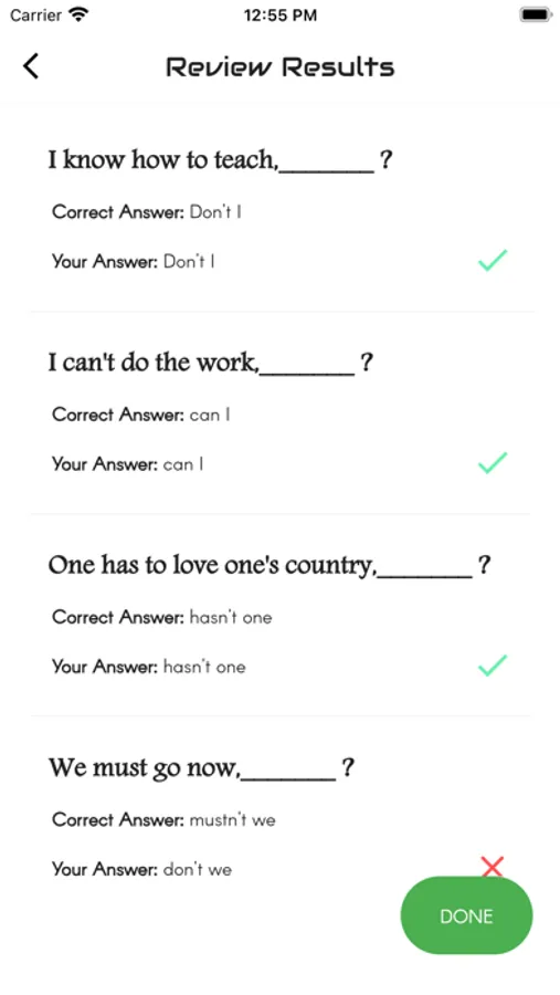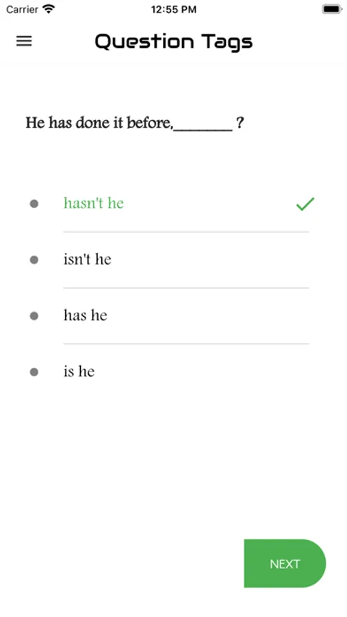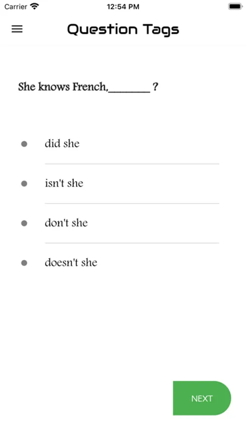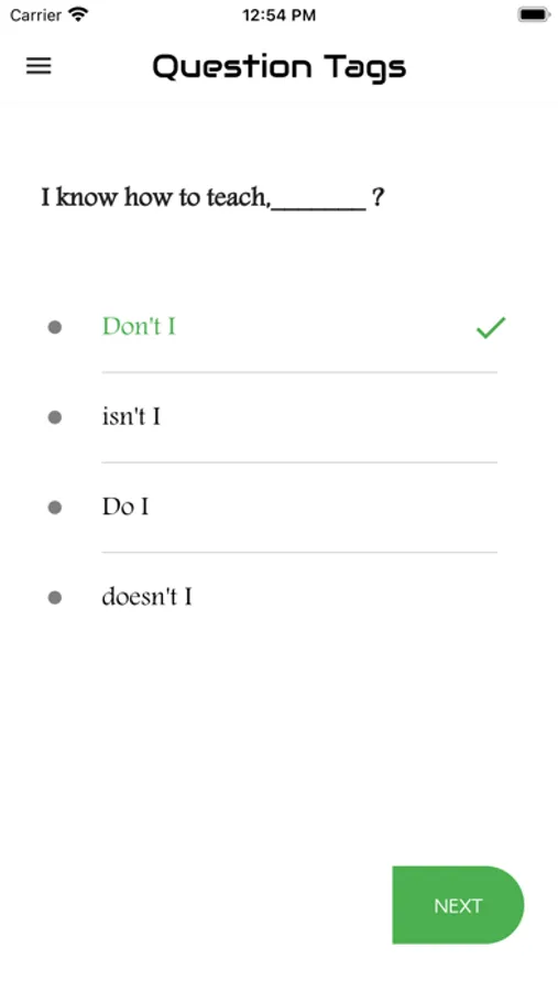 The aim of this app is to introduce you to the basic concepts of the grammar item "Question Tag ". The app features the interactive exercises based on it. It will enable you to learn the skills needed for analysing Question Tag. It will help you write any kinds of questions at various levels. Each test will help you to improve your knowledge greatly. Learners introduce here are for all levels. That means basic, intermediate and advanced learners. We have practice exercises where you can answer Tag Questions and get scores. There are lots and lots of questions to practice. You can analyse your test results also and check which are correct and which are wrong. This app designed to help you master over Question Tag..