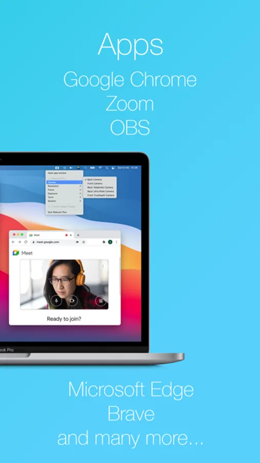Webcam Plus supports many apps, such as Google Chrome, Microsoft Edge, Zoom, OBS, and more. Please check app availability list on our website.