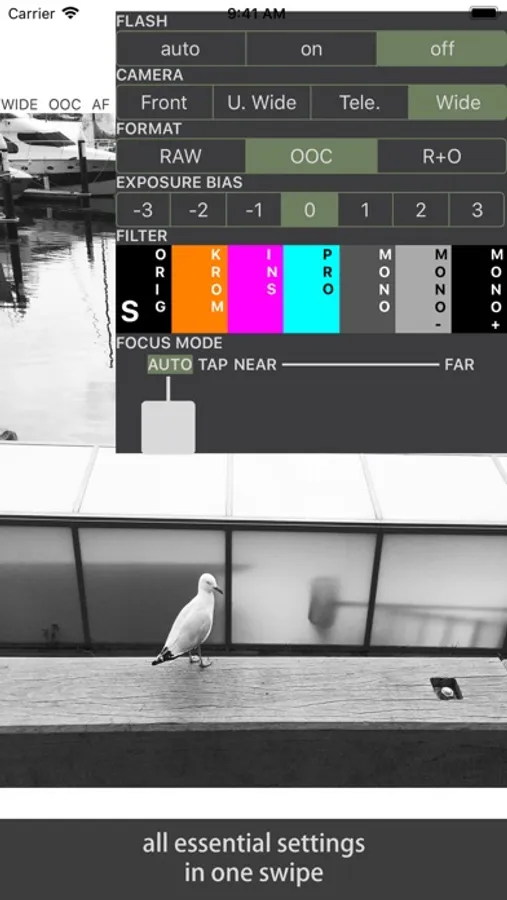 - swipe left/right can be customized to adjust filter or exposure compensation