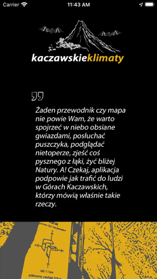 Masz już dosyć zatłoczonych uliczek z pamiątkami i kolejek do wejścia na szczyt? Góry Kaczawskie to idealne miejsce dla Ciebie! Dzięki naszej aplikacji nie przeoczysz miejsc wartych uwagi. Zwiedzaj pieszo, rowerem, samochodem. O znalezienie parkingów nie musisz się martwić - aplikacja poda ci ich współrzędne. Skorzystaj z przetestowanych już przez nas wycieczek lub odkrywaj samodzielnie tajemnicze miejsca i widoki zapierające dech w piersiach. Zdobywaj odznaki Kaczawskiego Podróżnika. Pobierz aplikację i przekonaj się, że zwiedzanie jeszcze nigdy nie było tak proste i przyjemne.