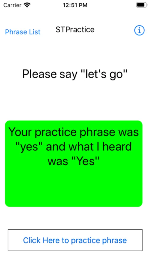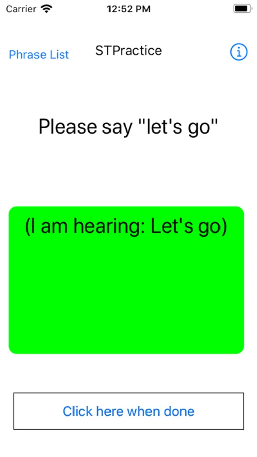 Speech Therapy Practice (STP) presents phrases to the user and the user presses a button to tell STP to start listening. The user than says the practice phrase aloud and then when done presses the stop button to let the application know they are done. STP then indicates whether it heard the phrase correctly, and if not displays what it heard. STP utilizes the iOS speech recognition technology to determine what it heard. So if your iPhone or iPad understands the user, it is likely others will too.
