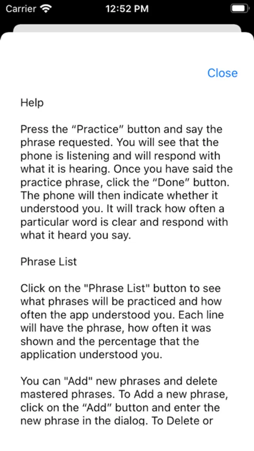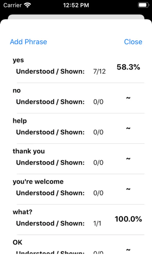 The initial phrase list contains the most commonly used speech therapy phrases. The phrase list can be tailored to each individual. In the phrase list, the application shows how many times each phrase has been presented and how often it was "understood". Speech Therapists can look at the phrase list and see if there are phrases that need to be practiced.