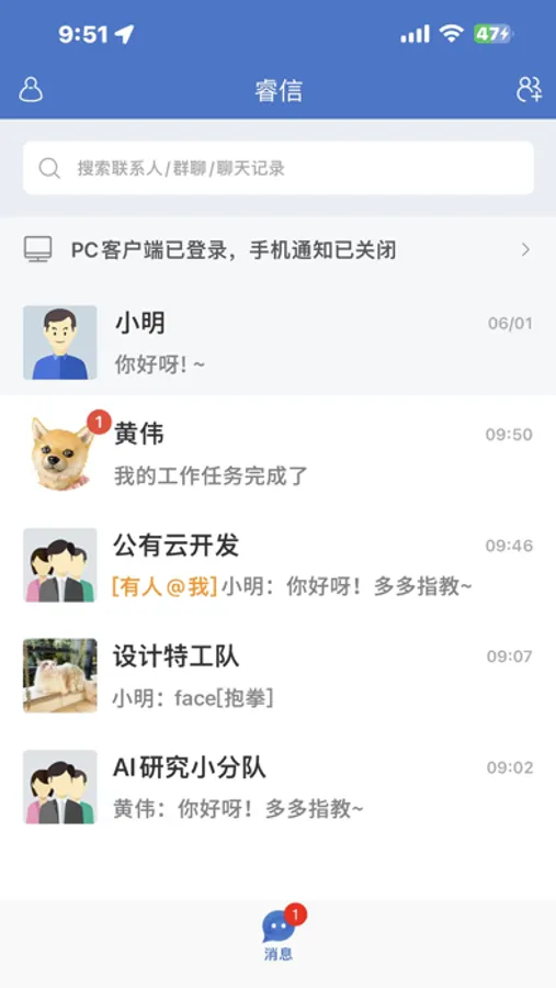 1.广东睿江云计算股份有限公司研发的即时通讯APP,为互联网公司企业定制的即时通讯APP