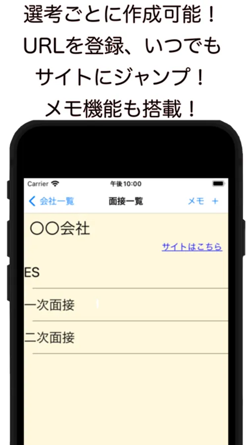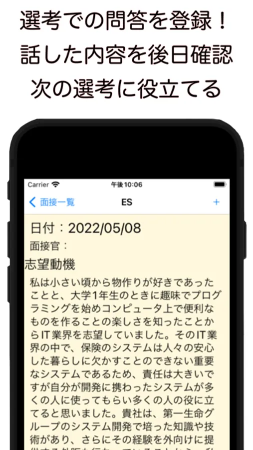 このアプリは、会社ごとにデータを管理し選考での問答や日時、面接官の名前などを保存しておくことができます。これにより次の面接の前に何を発言したかなどの確認ができ、選考を通して一貫した内容の発言をすることができます。また、スマホで管理するため、いつでもどこでも確認入力をすることができます。