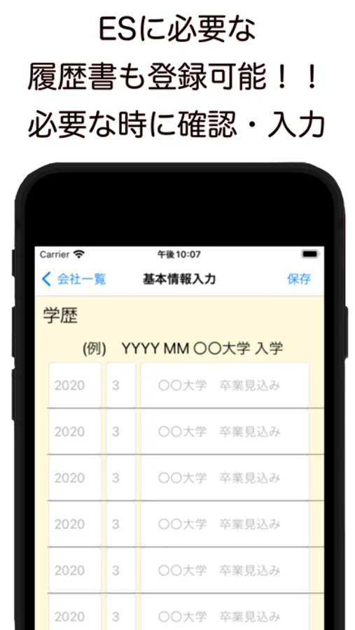 ESで必要となる学歴・資格・質問(強み弱みなど)の基本的なデータを保管しておくことができます。