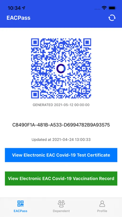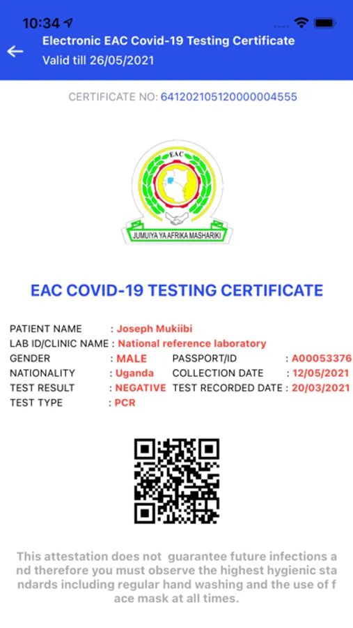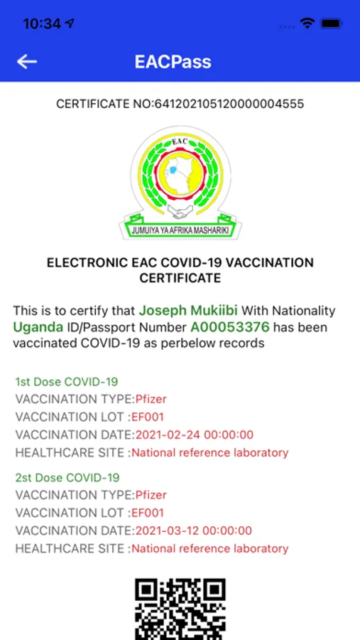 EAC Pass is provided from National system linking to Regional EAC system for members who tested negative and a traveling with in EAC region, EAC Pass is used to share test negative results of COVID-19 from each of EAC countries and to avoid double testing for citizens who travel across the EAC countries. QR Code is system generated and dedicated Health officials and will be at ports of exist (borders and airports)