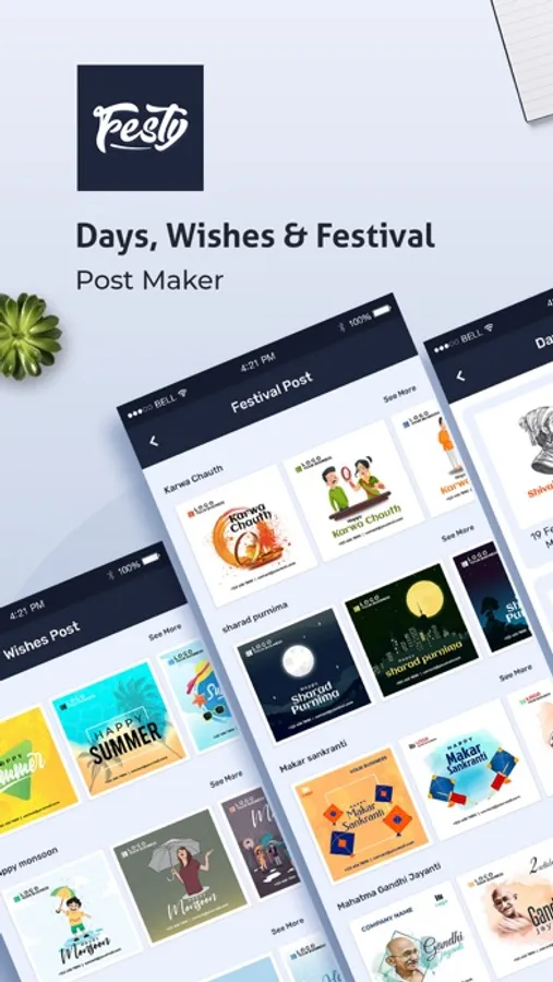 Festy - Days, Wishes & Festival Post Maker helps you with all types of small and large businesses for making a festival poster or photo with their brand logo. Best Editor for make festival banner with your logo and text. In this app, you have to simply select any festival poster frame or photo template which you liked for making festival greeting and promotion for your businesses.