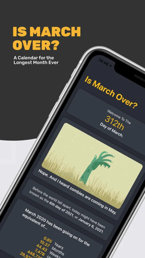 Is March Over is an interactive utility app that gives daily updates on the day as told by the calendar of a new era - March. Because let’s be honest, the fact it’s 2021 already is just too hard to believe. Just last week it was March, right? But somehow it’s been months since then? Truth is, March never ended. We’re all still there, and it’s been over three hundred days.