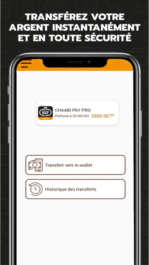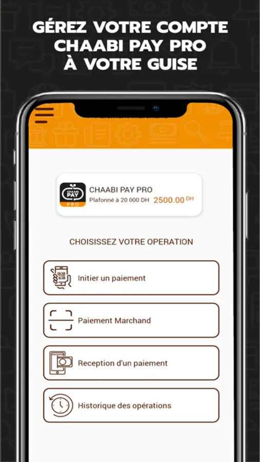 Avec Chaabi Pay Pro, encaissez instantanément votre argent, suivez vos opérations de caisse et gérez les paiements de vos clients en toute simplicité et quelle que soit leur montant grâce à une application mobile pratique et sécurisée offrant de nombreuses fonctionnalités :