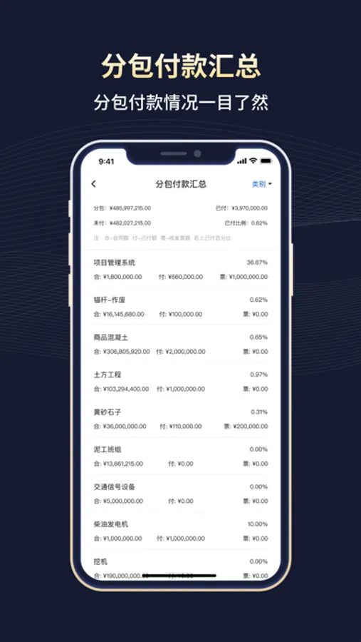 3、项目状态:项目费用控制状态、分包付款汇总、费用报销统计