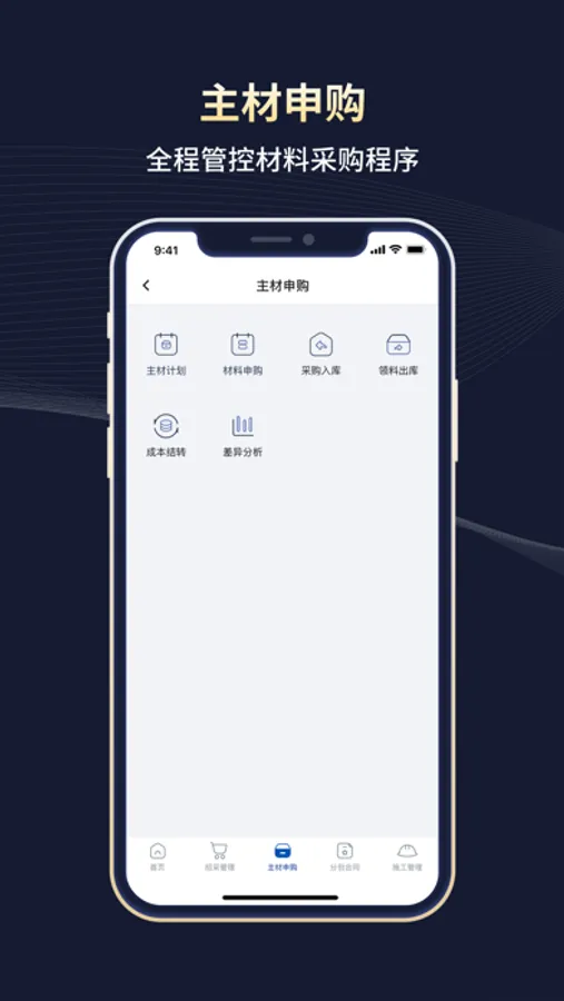 7、材料采购管理:主材计划、材料申购、采购入库、成本结转、领料出库、零星采购请购、零星采购入库、零星采购费用报销