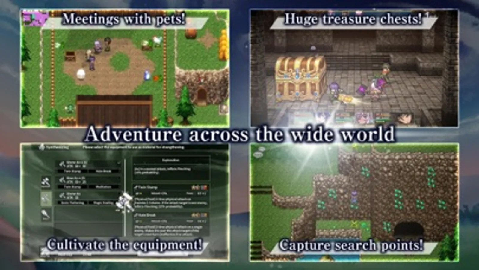 Throw yourself into the beautiful, complex turn-based battles, using magic swords with up to three weapons set! The overwhelming charm of pixelated graphics surround your entire world and adventure in a unique fantasy JRPG. Not to mention all the necessary elements from treasure hunting, quests, pet buddies to almost-infinite level caps!