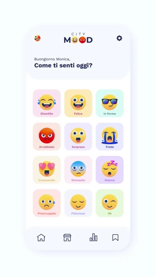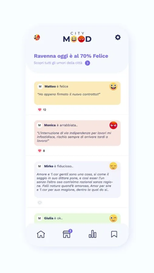 Le emozioni narrano i luoghi: City Mood è la fotografia dinamica del benessere cittadino, delle abitudini e necessità che emergono ogni giorno nella tua città. Ti aiuterà a capire le tue emozioni quotidianamente mentre le racconti alle persone con cui condividi luoghi, abitudini, comportamenti.