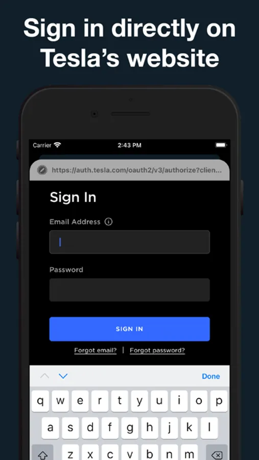 Authla will never save OR EVEN SEE your email or password, because Authla allows you to log in to your Tesla account directly on Tesla's website.