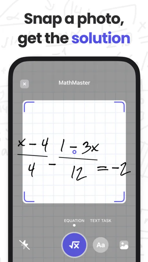 MathMaster helps to do the math for you. Just use your camera, snap a picture of a math problem or load an image, and get the right answer on your screen. If you need to get a better understanding of how to solve a problem - just check a step-by-step solution.