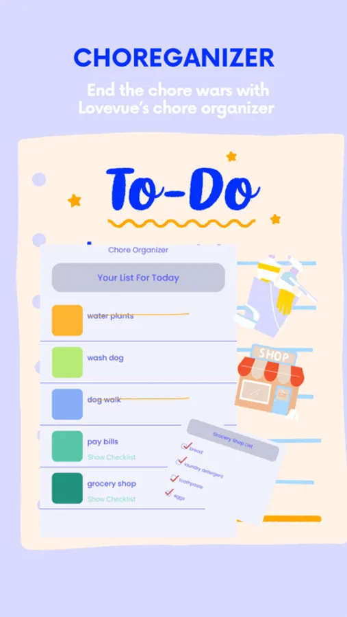 ● Assign one-time or recurring tasks to you or your partner and see all upcoming chores at a glance with LoveVue’s Chore organizer.