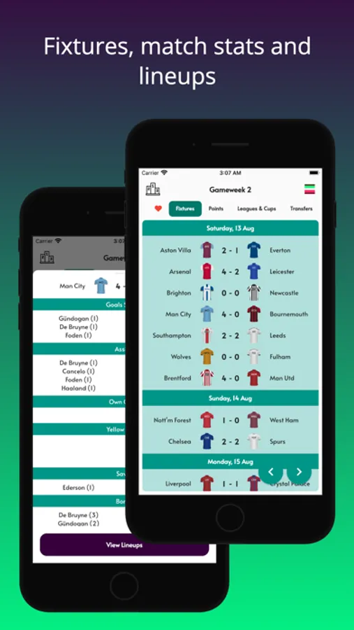 - View fixtures, match stats and lineups