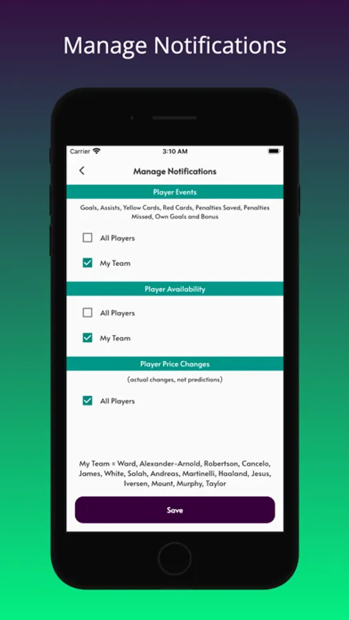 - Receive your team-specific live notifications for goals, assists, yellow cards, red cards, more in-game events, price changes and player injuries/suspensions.