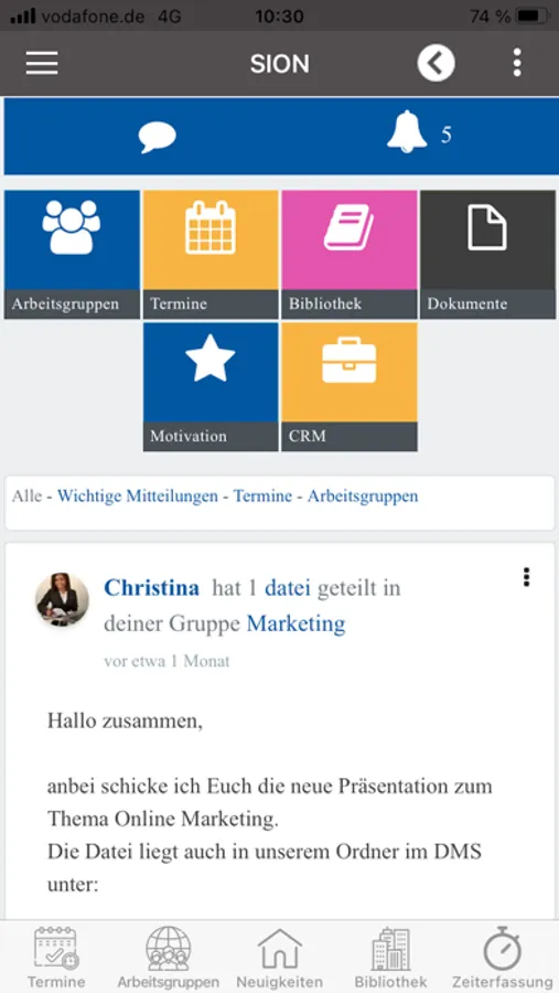 Functions such as chats, group chats, video calls, work groups, libraries, document management, time tracking, CRM and many more ensure that all employees are always up to date and connected, whether they are working in the office, from the home office or on the road.