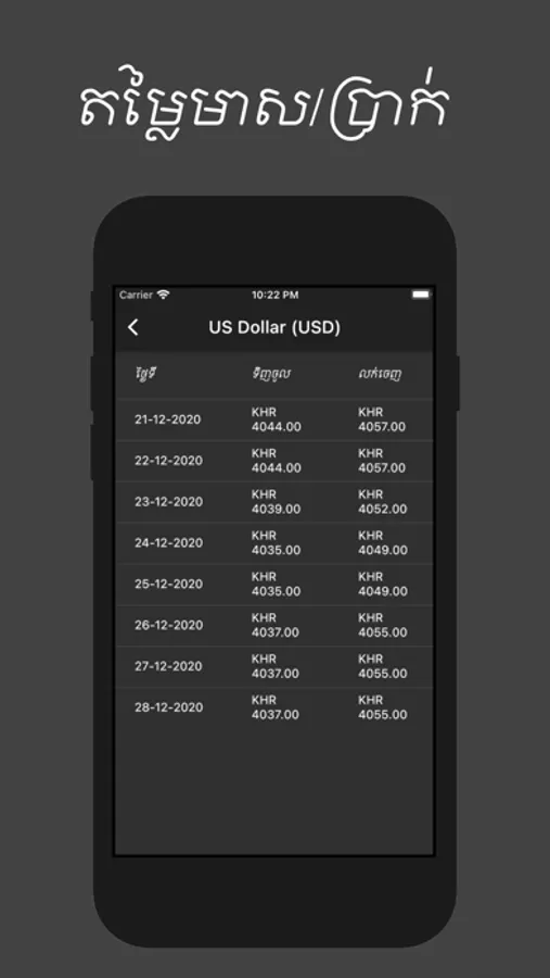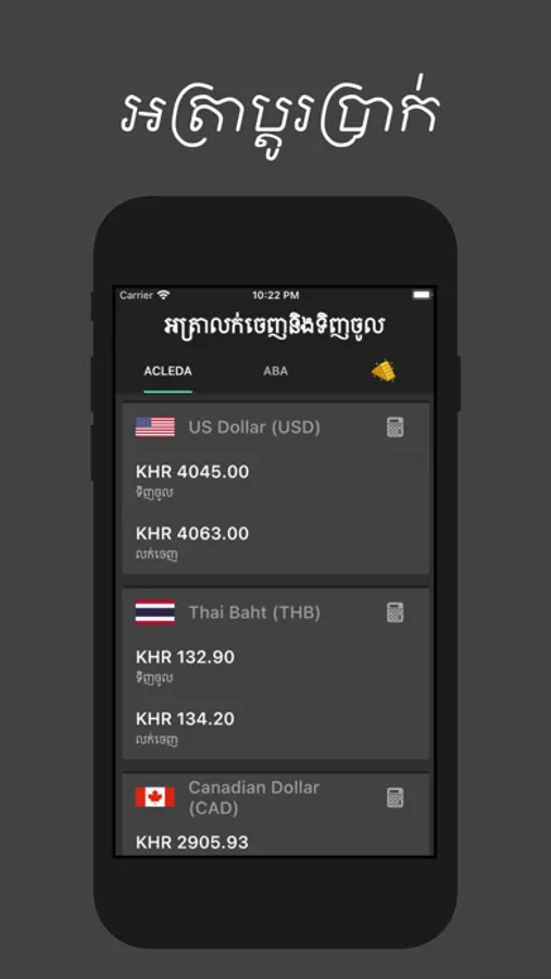 Khmer Exchange Rate is an exchange rate App we offer the foreign exchange in 12 currencies such as Khmer Riel, US Dollar, Thai Baht, Euro*, Australian Dollar*, Vietnamese Dong*, Canadian Dollar*, Japanese Yen*, UK Pound*, Lao Kip*, Chinese Yuan*, Singapore Dollar*.