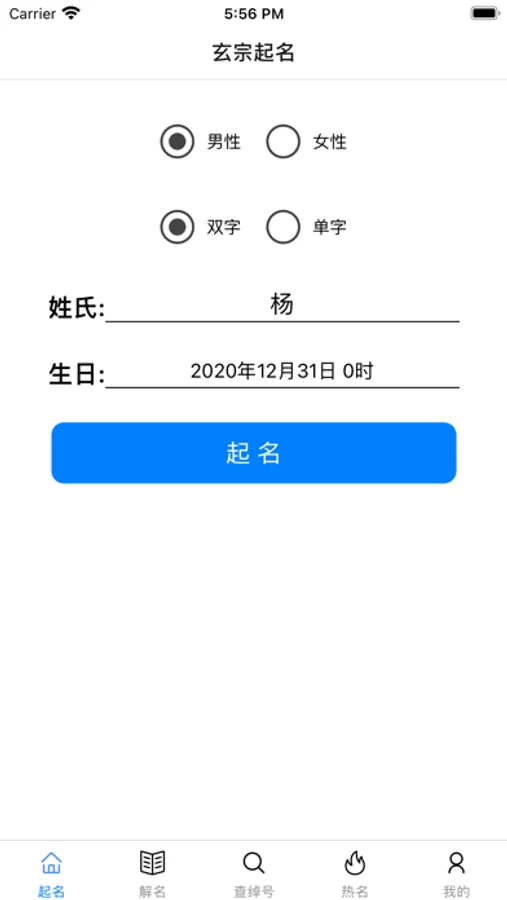玄宗起名是由杨坤开发的一款专注于起名、改名、解名的专业起名软件. 根据人的生辰八字、生肖、五行、三才、五格等多种因素帮您从千万个名字里筛选合适的名字。玄宗起名专注于: 牛年起名、生肖起名、八字起名、五行起名、宝宝起名、唐诗起名、宋词起名、诗经起名、楚辞起名、周易起名.