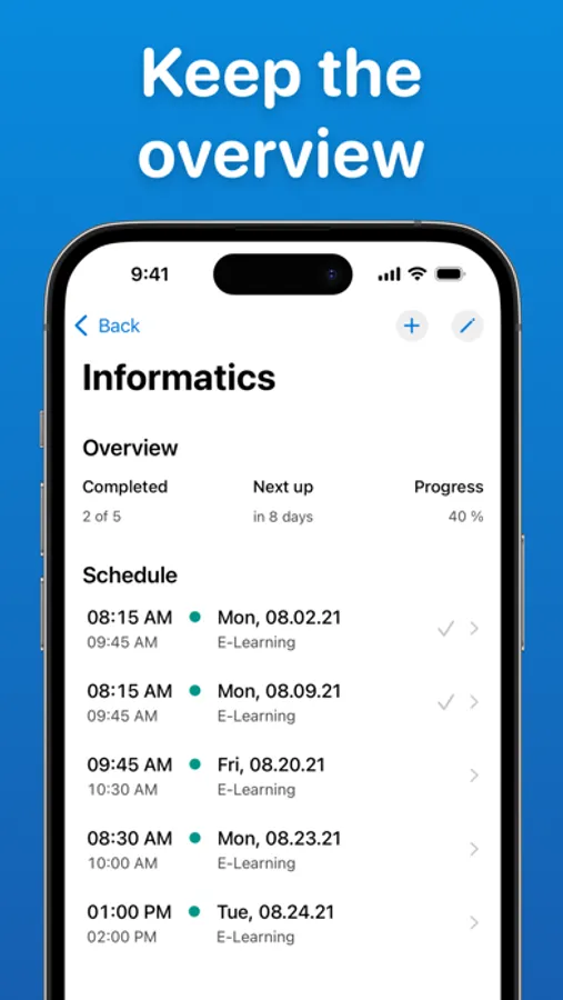 - In addition to the number of events and exams already completed, the app also shows you a countdown of when your next event is due.