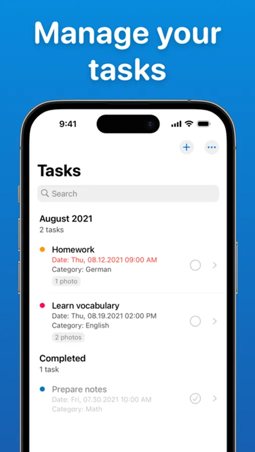 - Organize your tasks in categories that the app suggests or that you create yourself, for example, to assign them to a course.